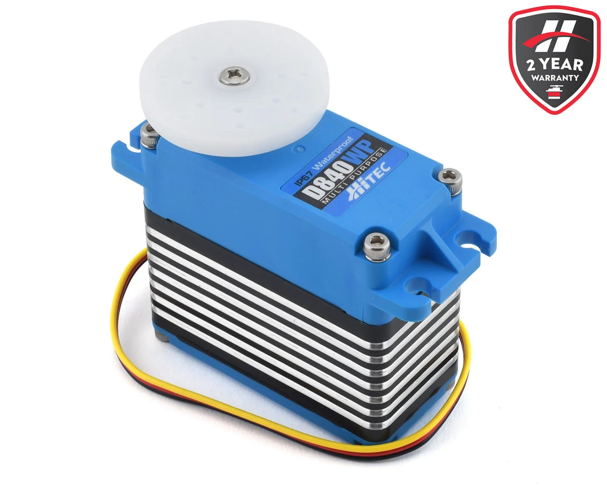 This is a Hitec High Voltage D840WP Waterproof High Speed Steel Gear Servo, designed using Hitec’s redesigned, cutting edge, custom engineering. Combining industry leading high-resolution, state-of-the-art ultra-response technology with a 32-bit MCU and 12-bit ADC for unprecedented programmability and flexibility, these servos deliver significantly smoother movement. The speedy, powerful line operates on a wide 4.8 ~ 8.4 voltage range, allowing use with any common battery chemistry without the need for adapters or regulators. Featuring Hitec’s 15 tooth HD output spline with 3mm hex screw, each D-Series servo brings monster performance never known before in the market.