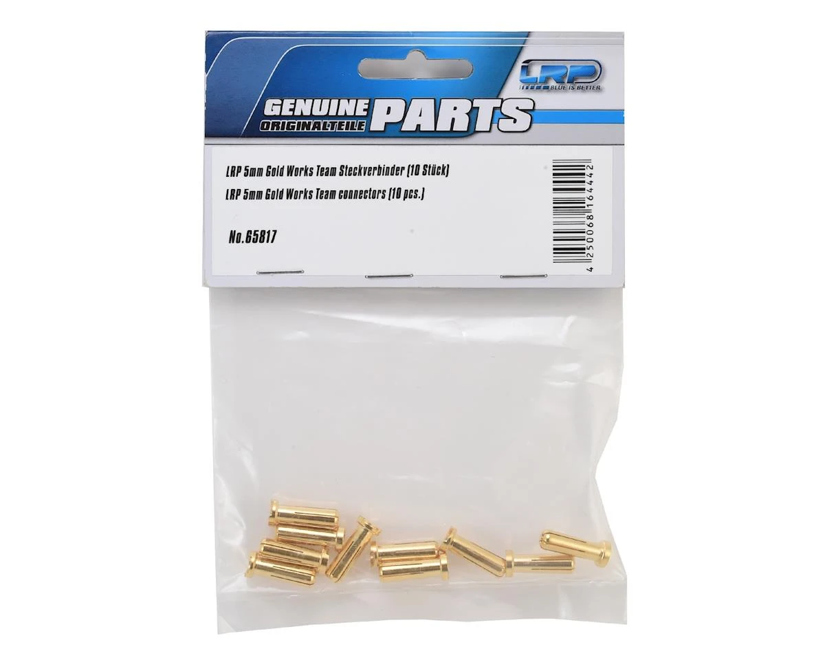 This is a pack of ten LRP 5mm Gold Works Team Bullet Connectors. These connectors are ideal for use with competition batteries that use a 5mm bullet.Â