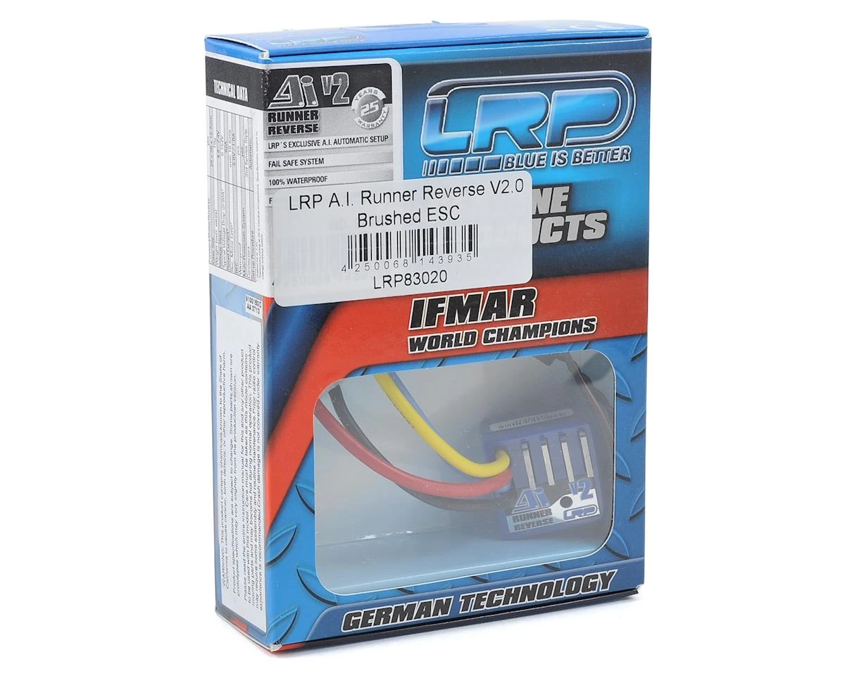 This is the LRP A.I. Runner Reverse V2.0 Brushed ESC. With LRP’s Multi-Protection System, A.I. Automatic setup technology, waterproof construction, built in fail safe and 25 year manufacturers warranty, the A.I. Runner Reverse V2.0 is an excellent choice for a brushed motor ESC.
