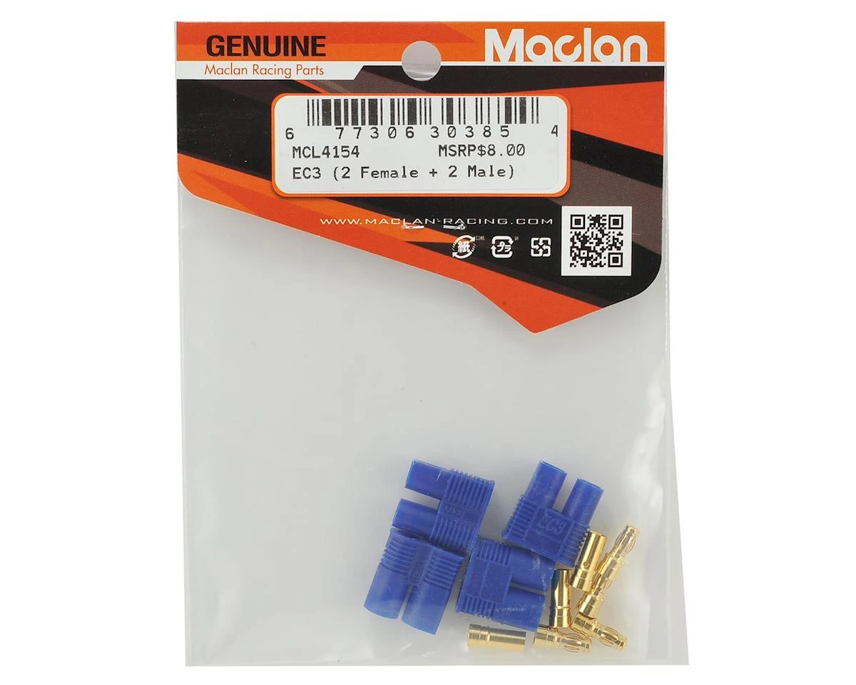 Maclan EC3 Connectors. These are genuine EC3 connectors and are compatible with any application that uses a male EC3. Standard applications for the female connector recommend that the female end be installed in battery applications, and the male end be used in ESC or battery charger applications. Package includes four connector housings, four female 3.5mm bullets and four male 3.5mm bullets.