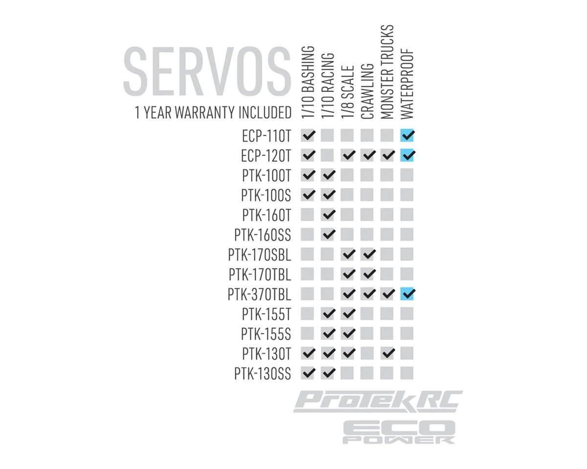 Plus, instead of a cheap plastic servo horn, ProTek R/C goes the extra mile with an included aluminum single arm servo horn that will stand up to a majority of the punishment you can throw at it. And for additional rigidity, four blue aluminum servo ear guides are included as alternatives to the rubber grommets. Stop wasting your money on budget servos that look good in the spec list, but fall short when its time to perform. Get ProTek and don’t look back.