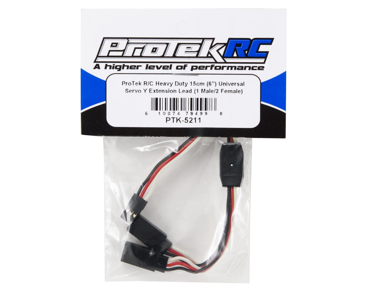 This is one 15cm (6″) universal servo Y extension lead from ProTek R/C. These are excellent servo extension leads made with thick, high quality 22awg wire for maximum current carrying capacity and strength. The male plug installed on these extension leads are JR style connectors and will work with any radio system. The two female ends are designed to accept Futaba connectors, as well as JR, Aitronics and HiTec connectors. When plugging JR style connectors into the female connector, be sure to check for the correct polarity.