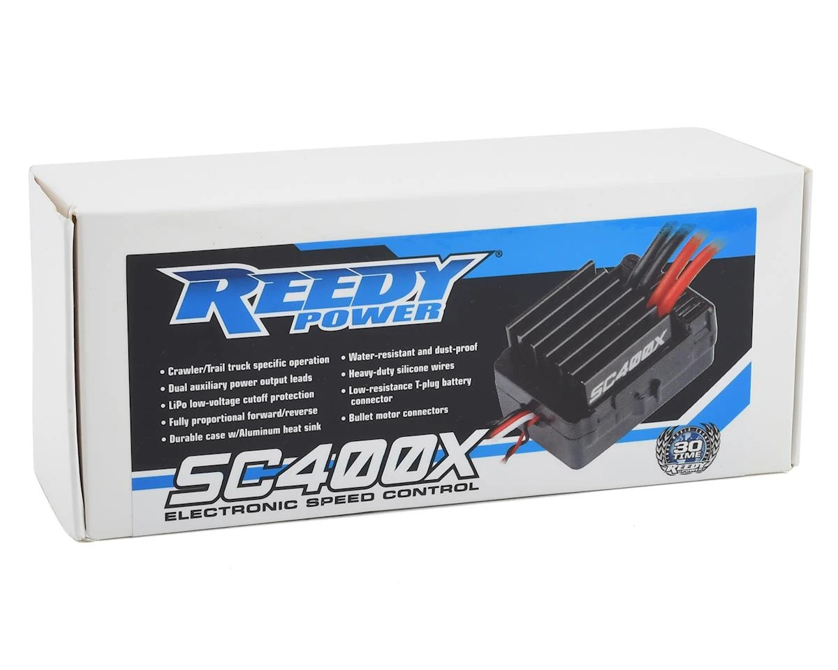The SC400X is 2-3S compatible and equipped with advanced features intended specifically for crawlers and trail trucks. Fully proportional forward and reverse gives precision control on rocky terrain while an option of 0%, 50%, or 100% drag brake setting helps maintain control on steep ascents and descents. Convenient dual auxiliary power leads can be used to power LED lighting or other scale accessories.