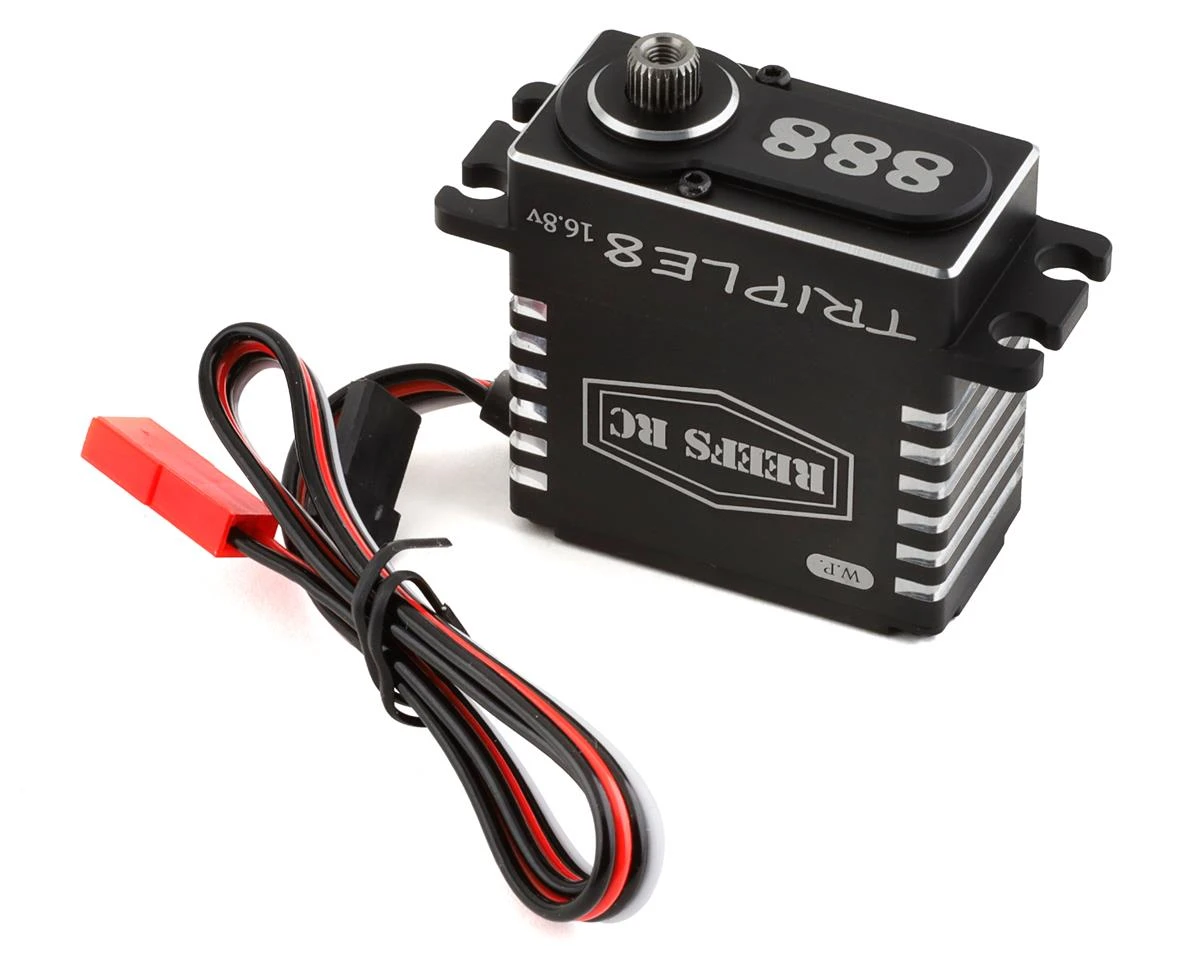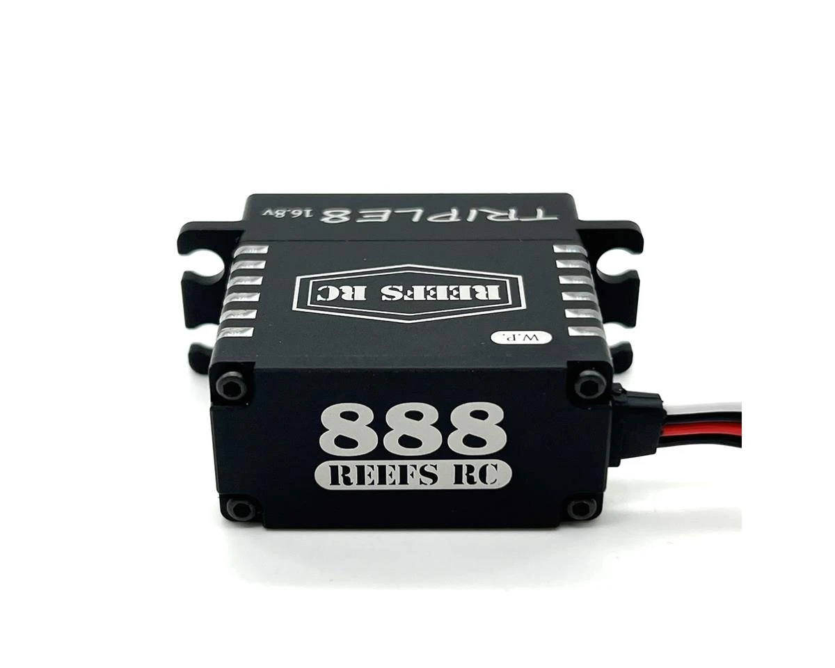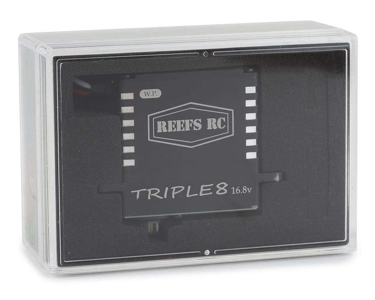 Reefs RC Triple 8 Programmable Digital Brushless Servo. This high voltage servo is a great option for those demanding serious power from their servo. The Triple 8 is capable of over 900oz of torque at 16.8v! Deliver ultimate power to your crawler with the Reefs Triple 8 Servo. Package includes one servo, two nylon horns and hardware.