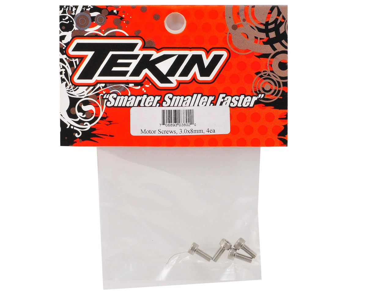 This is a pack of four Tekin 3x8mm Motor Screws. These are standard size motor mounting screws that can be used in a majority of 1/10 scale applications.