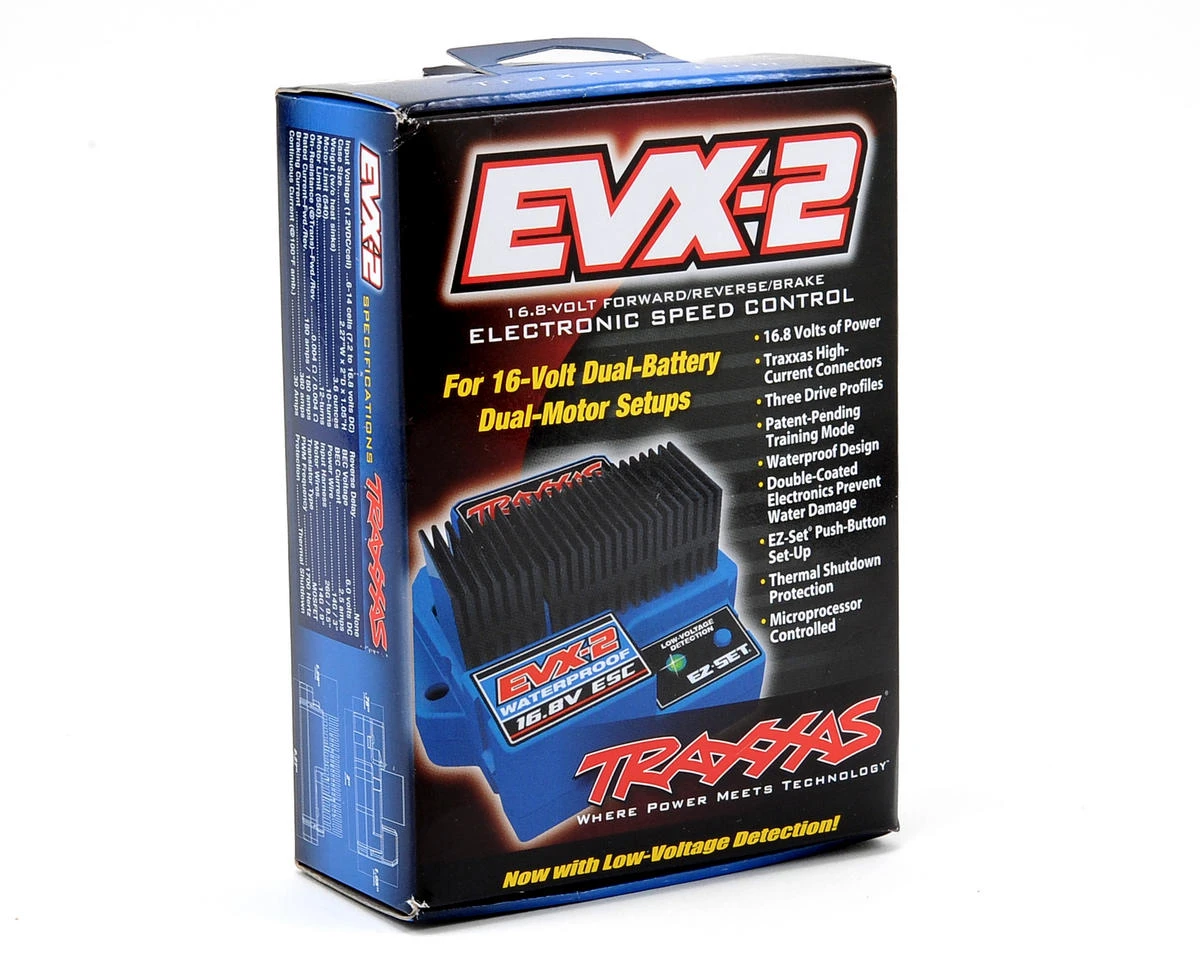 This is the Traxxas EVX-2 Forward/Reverse Speed Control. This ESC is recommended for 16.8V dual battery/dual motor applications. The EVX-2 delivers an incredible 16-plus volts, from two battery packs, making 16.8-volt, twin-motor setups more powerful than ever! Designed by Traxxas, the EVX-2 features a completely waterproof design, three drive profiles, Thermal Shutdown Protection, and gold-plated Traxxas High-Current Connectors. The EVX-2 also includes patent-pending Training Mode. This profile reduces the overall power output of the EVX-2 by 50% making it easier for young/new drivers to develop their control skills before unleashing full-power operation. EVX-2 is equipped with two-stage low voltage detection (LVD) to allow LiPo battery use.