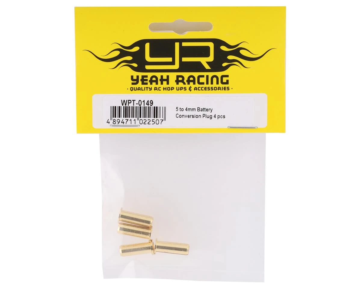 Yeah Racing 5mm to 4mm Bullet Adapter Plugs. These conversion plugs are great for plugging 4mm bullet ESC connectors into a 5mm battery. Package includes four adapter plugs.