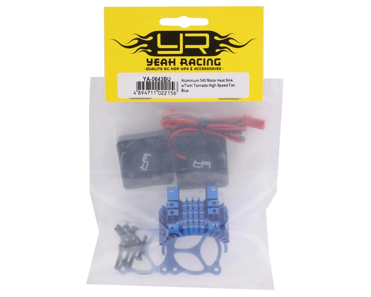 The Yeah Racing Aluminum 540/550 Motor Heat Sink with Twin Tornado Fans. These optional fans mount on the included bracket and use only one wire for power. This means you get two fans off one power source. The included heatsink mount has been designed to fit on both 540 and 550 motors. Available in multiple colors to ensure you can best match your ride. Package includes one motor heatsink, on fan mount, two fans and eight cap head screws.